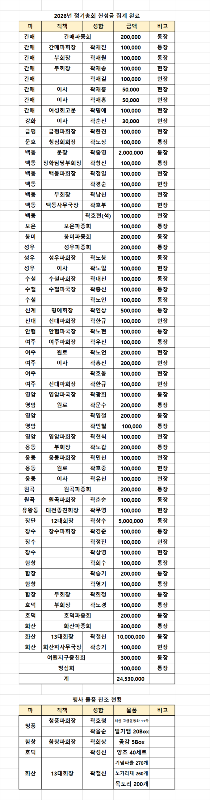 청주곽씨대종회는 18일 서울 리버사이드호텔에서 2026년 정기총회를 개최하고 제 11, 12대 창수 회장의 이임식과 제 13대 철신 회장의 취임식을 가졌다.